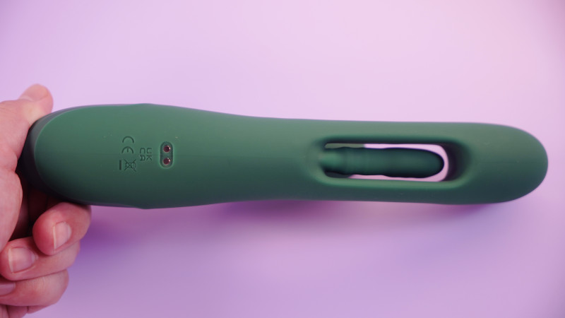 Верхняя кнопка отвечает за включение клторальной части, за включение язычка вращения на 360, единоразовым нажатием на кнопку включения можно управлять дополнительной вибрацией в вагинальной части.